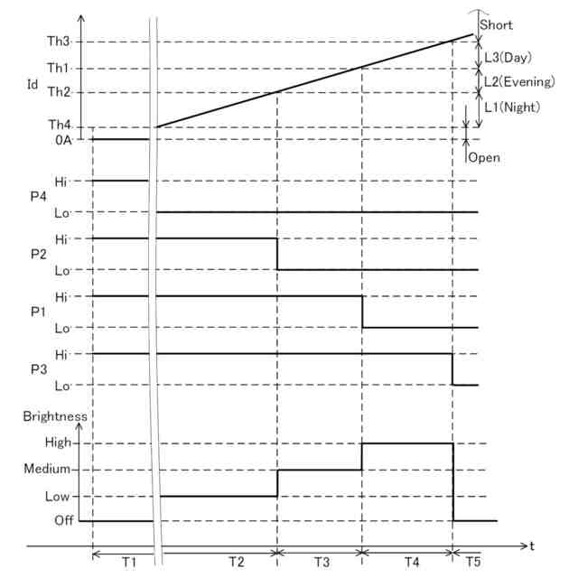 本開示の一実施形態に係る検出電流(Id)、各ポート(P1~P4)の入力信号と点灯輝度の状態を示すタイミングチャートである。