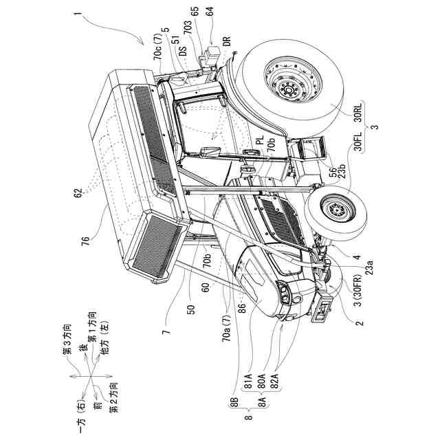 以下、本発明の一実施形態に係る作業車両について、図面を参照しつつ説明する。なお、以下の説明において、作業車両の直進方向(前進・後退する方向)及び上下方向と直交する方向(車幅方向)を第1方向ということとし、作業車両1の直進方向(前進・後退する方向:前後方向)を第2方向ということとする。また、第2方向において、作業車両の前進側を前方といい、作業車両の後退側を後方ということする。これらの定義に併せ、上下方向を第3方向ということとする。