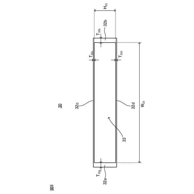 図1~8に示されるように、一実施形態に係る電池100は、電極積層体10と集電部20と端子30とを有する。前記電極積層体10は、前記集電部20を介して、前記端子30に電気的に接続される。前記端子30は、基部31と突出部32と開口33とを有する。前記突出部32は、前記基部31から前記電極積層体10側に突出する。前記開口33の形状は、前記突出部32によって画定される。前記集電部20は、前記開口33に挿入されて、前記端子30に接続される。前記突出部32の一部分は、前記突出部32の他の部分よりも厚い。