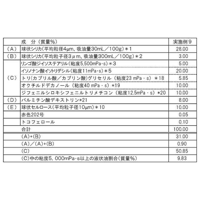 また、成分(A)の球状シリカは、吸油量60mL/100g以下であるが、製造時の充填性、塗布時の伸びやムラのなさ、塗布直後のマットな自然な仕上がり、塗布後の自然な仕上がりの持続性の観点から、50mL/100g以下が好ましく、40mL/100g以下がより好ましい。また、同様の観点から、1mL/100g以上が好ましく、10mL/100g以上がより好ましい。また、成分(A)の吸油量は、1~60mL/100gが好ましく、10~50mL/100gがより好ましく、10~40mL/100gがさらに好ましい。