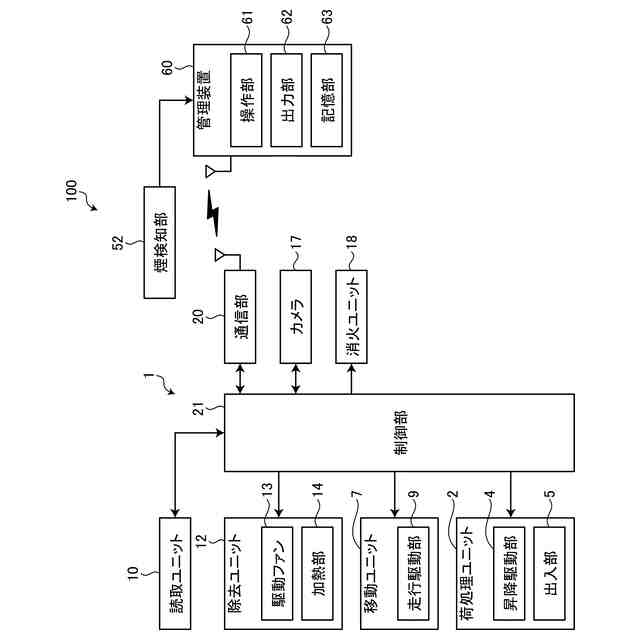 また、倉庫内において火災が発生した場合、火災を消火するために二酸化炭素消火剤等の消火剤が放出される。消火剤の比重は空気の比重よりも大きいため、放出された消火剤は、消火後、倉庫内の下方部(例えば床面付近)に溜まり易く、識別子や読取装置の光学系に付着する可能性が高い。このような消火剤も、上述した塵埃等と同様に、読取装置による識別子の光学的な読み取りを阻害する異物となり、識別子の読取エラーの発生原因となり得る。