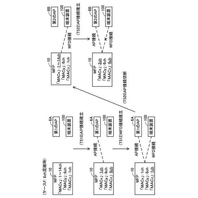 図1に示されるように、通信システム2は、MFP10と、端末装置100と、第1のアクセスポイント6Aと、第2のアクセスポイント6Bと、を備える。以下では、アクセスポイントのことを「AP」と記載する。本実施例において、第1のAP6Aは、2.4GHz帯の1chを通信チャネルとして利用し、第2のAP6Bは、2.4GHz帯の2chを通信チャネルとして利用する。以下では、第1のAP6A及び第2のAP6Bを総称して、「AP6」と記載することがある。