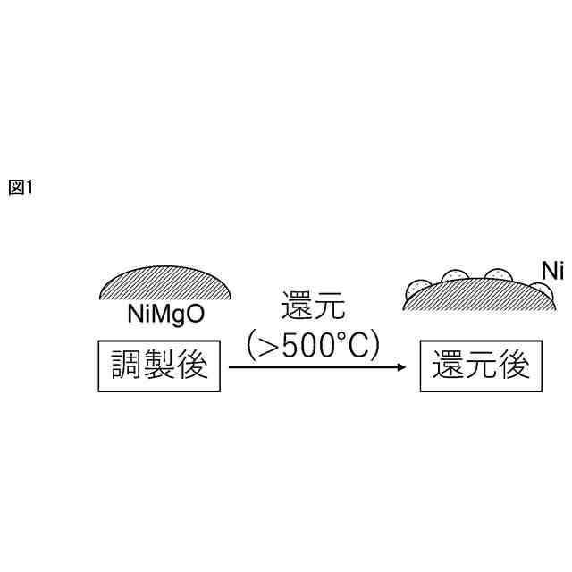 NiとMgの複合酸化物からなる触媒の模式図である。