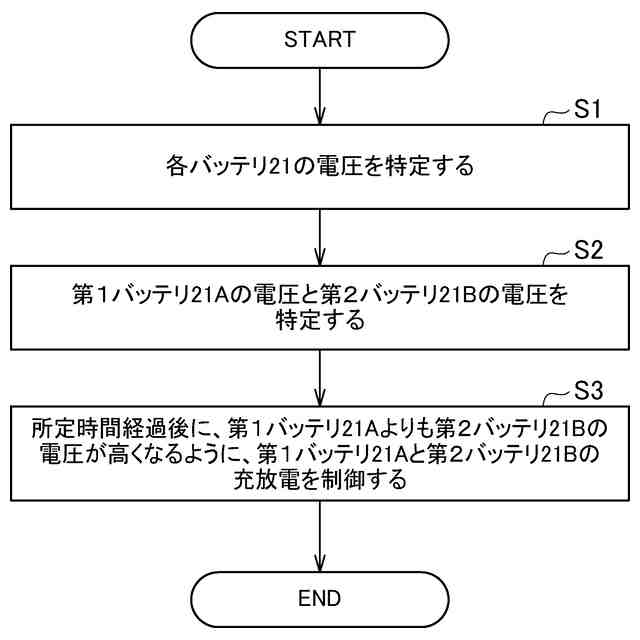 前記制御部(23)は、所定時間経過後に、前記第1バッテリ(21A)よりも前記第2バッテリ(21B)の蓄電電圧が高くなるように、前記第1バッテリ(21A)と前記第2バッテリ(21B)の充放電を制御する