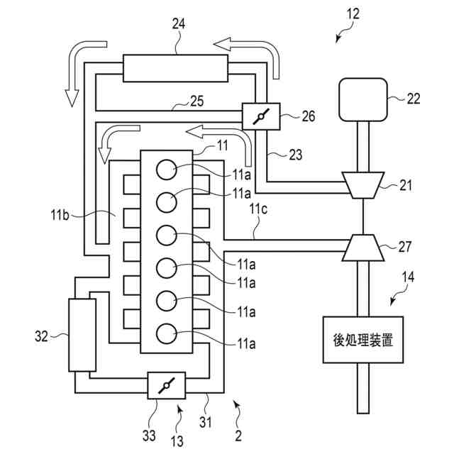 図1及び図2に示すように、車両1は、動力源として内燃機関11と、過給システム12と、内燃機関11の排気の一部を再循環するEGRシステム13と、内燃機関11の排気の一部を処理する後処理装置14と、を有する。なお、車両1は、内燃機関11に加えて、動力源として1以上のモータを搭載したハイブリット車(HEV:Hybrid Electric Vehicle)であってもよい。車両1は、例えばトラックである。車両1は、例えば、平ボディ車、ウイング車、幌付き車、ユニック車、車載車、タンクローリー車等である。なお、車両1は、トラックに限定されず、バス、乗用車、特殊用途自動車等であってもよい。