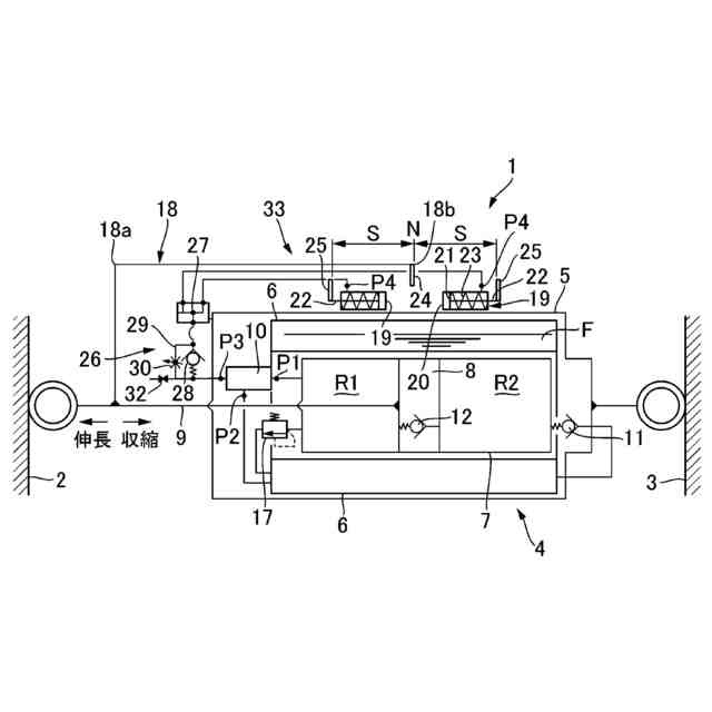 特許文献2のオイルダンパシステムでは、免震用のダンパ装置は、ピストンを移動させるピストンロッドの端部に取り付けられて、ピストンロッドの伸縮ストローク量を伝達する伝達棒状部材と、ピストンロッドの伸縮ストロークの方向に沿ってそれぞれ設けられ、制御用油が充満されたシリンダケース、及び制御用ピストンロッドの伸長作動によってシリンダケース内の制御用油を吐出ポートから吐出させる制御用ピストンを有し、ピストンロッドに、所定の伸縮ストローク量を超える超過伸長ストローク量または超過収縮ストローク量が生じたときに、伝達棒状部材によって、これらの超過伸長ストローク量または超過収縮ストローク量で制御用ピストンロッドを伸長作動させて、吐出ポートから制御用油をそれぞれ吐出させる、一対の制御用シリンダユニットとを含むダンパ性能可変機構を備えており、伝達棒状部材は、一端が前記ピストンロッドの先端部に接続されて、ピストンロッドの伸縮ストローク量を制御用シリンダユニットの制御用ピストンロッドに伝達する、長尺棒状の伝達部材となっている。