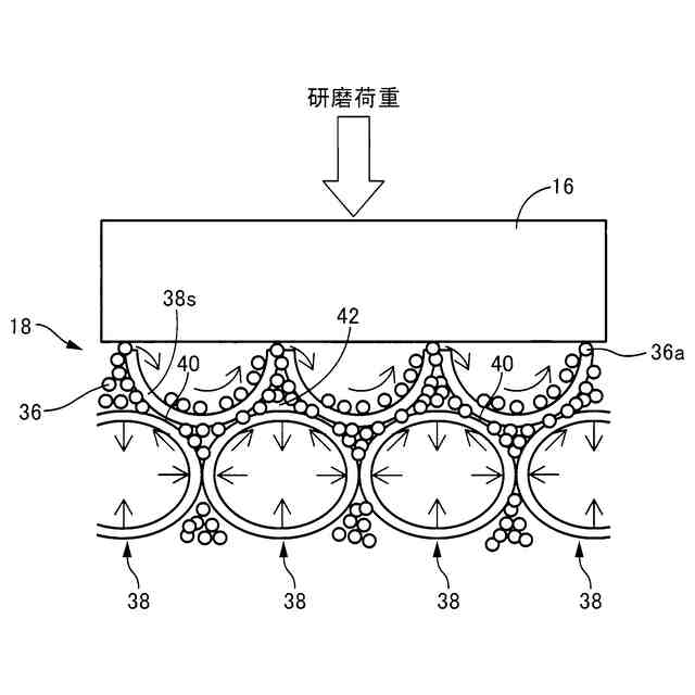 特許文献2に記載された砥粒内包型研磨パッドでは、連通気孔を有する多孔質の母材樹脂と、母材樹脂内に形成された長手状の連通気孔に内包された多数の研磨砥粒と、母材樹脂により連通気孔間に形成され、連通気孔よりも断面積が大きい大径気孔とが備えられている。研磨加工に際して、圧力が加えられると、マイクロポンピング作用(加圧により研磨パッドが押しつけられて連通気孔内の研磨砥粒が大径気孔に向かって押し出される作用)により、連通気孔に内包された研磨砥粒が、連通気孔に連通する大径気孔内に移動して表層の大径気孔内に研磨砥粒が多数滞留し、ワークの下面に接触する作用砥粒が増加するため、研磨能率が高められる。このような作用は、セリア粒子等のいびつ(非球形)な形状で動きが困難である研磨砥粒の場合に顕著である。