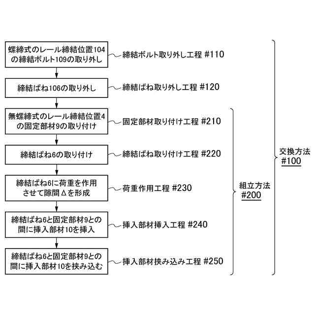 請求項1の発明は、図1、図2、図4、図6、図13、図14、図17、図18、図20及び図22に示すように、レール(2)を支持体(3;12)に締結するレール締結装置の組立方法であって、前記レールを押え付ける締結ばね(6)と、前記支持体に取り付けられる固定部材(9)との間に、挿入部材(10)を挿入するための隙間(Δ)が形成されるように、この締結ばねに荷重作用部(11)から荷重を作用させる荷重作用工程(#230)を含むことを特徴とするレール締結装置の組立方法(#200)である。