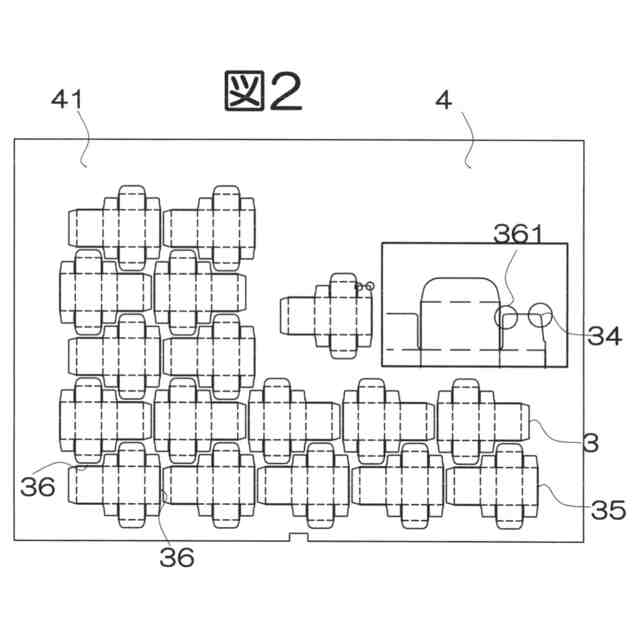 また、このレイアウトで外観可視直線35にニックが付けられないと、打ち抜かれた後、次の工程に移送される時に6mmのカス部分の間隔、通称、ドブ36が浮き上がり機械の中でジャミングして、緊急停止しなければならない。カタログ値9000ショツト/Hの打抜機でも5000-6000ショツト/Hで打ち抜いている。外観可視直線35に見えないマイクロニックが付けられると、移送で浮き上がることはないので9000ショツト/Hで打ち抜くことが可能である。マイクロニックにすると30-40%の打抜スピードが上がるのである。