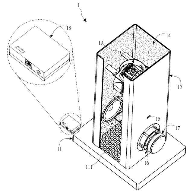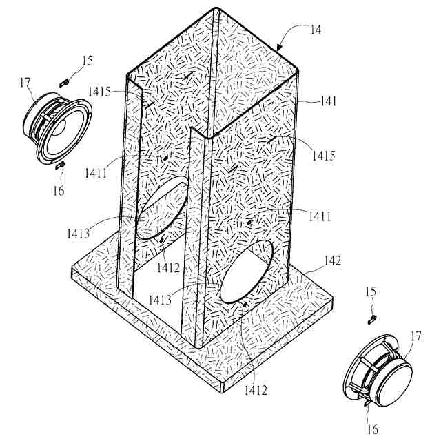 前記少なくとも1つのスピーカは、設置位置を有し、かつそのコーンのサラウンドリングを介して前記第1吸音パーツをくぐり抜けて前記内部空間に露出するように設置され、この方式によってその音発生部位を前記内部空間に対面させ得るようにし、