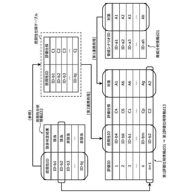 前記第1評価仕様情報の前記評価項目ごとに、前記脆弱性分析情報に含まれている、当該評価項目に対応する分析結果である前記脆弱性の識別情報が、当該評価項目の前記評価仕様に関連付けられるように、前記識別情報を前記第1評価仕様情報に連結することによって、前記第2連携処理を行う、