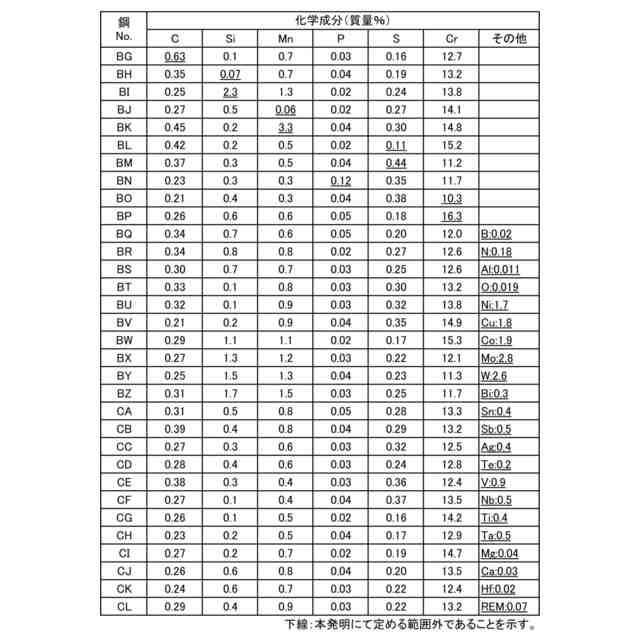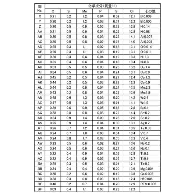 [2]質量%で、C:0.08~0.60%、Si:0.1~2.0%、Mn:0.1~3.0%、S:0.15~0.40%、P:0.10%以下、Cr:11.0~16.0%、残部Feおよび不純物からなる化学成分を有し、