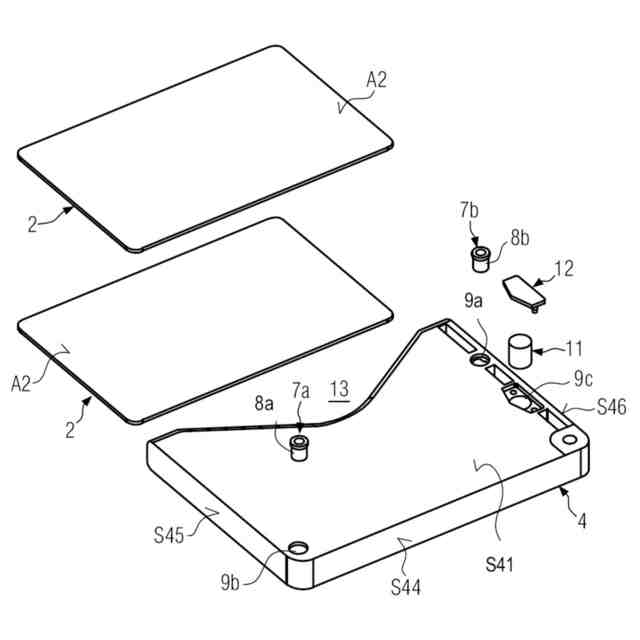 それに応じてこの容器は、それぞれプラスチックで製作される第1の容器部分と第2の容器部分とを有する。両方のハウジング部分は1つの角領域で、互いに一直線上に並ぶ切欠きとその中に係合する隆起部とで旋回軸を形成するスプリングキャッチ結合によって結合され、第2の部分が第1の部分を介して旋回可能である。第1の容器部分は1つの端面にカードのための開口部を有し、すなわち、カードをその短辺を前にして差込可能である。第1の容器部分はそれ以外では閉じている。両方の主面は段差のある縁部輪郭を有している。さらに主面は角領域に、外方を向く隆起部を有する、弾性作用のある舌部を有している。第2の容器部分は、上側の側面と端面とに沿って延びる開口部を有している。すなわち第2の容器部分は、第1の部分の開口部を覆うために、その第2の端面で閉じている。主面は、旋回軸を形成するために隆起部が中に係合する切欠きを有している。