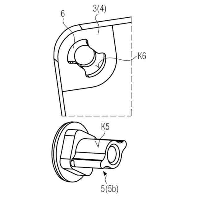 この課題は本発明によると、一方では請求項1に基づき、外側の第1の容器部分を内側の第2の容器部分と角領域で結合するために、輪郭づけされた組付ピンが、第1の容器部分と第2の容器部分との、同軸に配置されたそれぞれ対応する輪郭づけされた貫通開口部を貫通し、第1の容器部分の中に入る、およびこれから外に出る、第2の容器部分の最大の旋回は、組付ピンの幾何学的な輪郭によって、上側シェルと下側シェルの貫通開口部の輪郭との協同作用のもとで制限されることによって解決される。組付ピンは、特に二重中空リベットとして構成されていてよい。