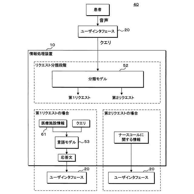 情報処理システム40は、情報処理装置10とユーザインタフェース20とを含む。ユーザインタフェース20は、病室45(図2参照)に配置されているスマートスピーカ等の情報機器である。情報処理装置10は、ネットワークを介してユーザインタフェース20に接続されたサーバまたはクラウドシステム等である。