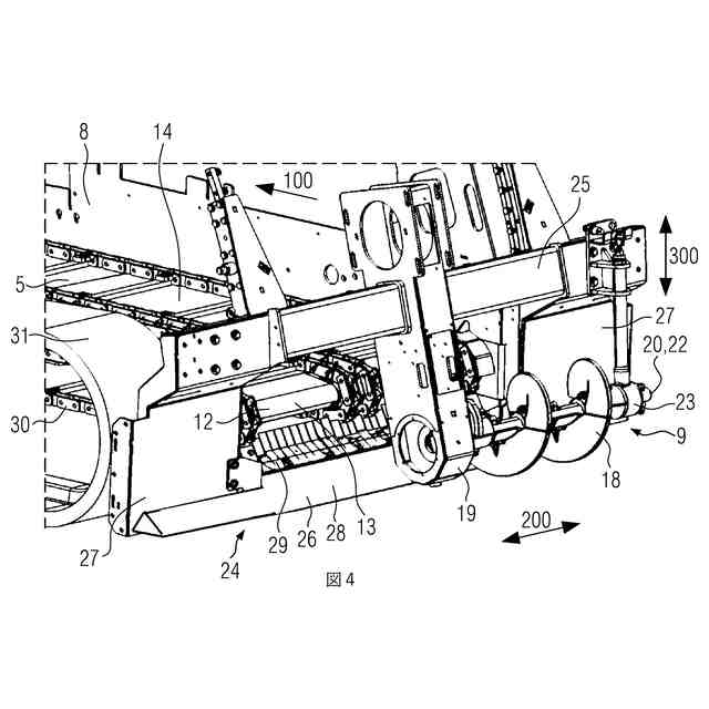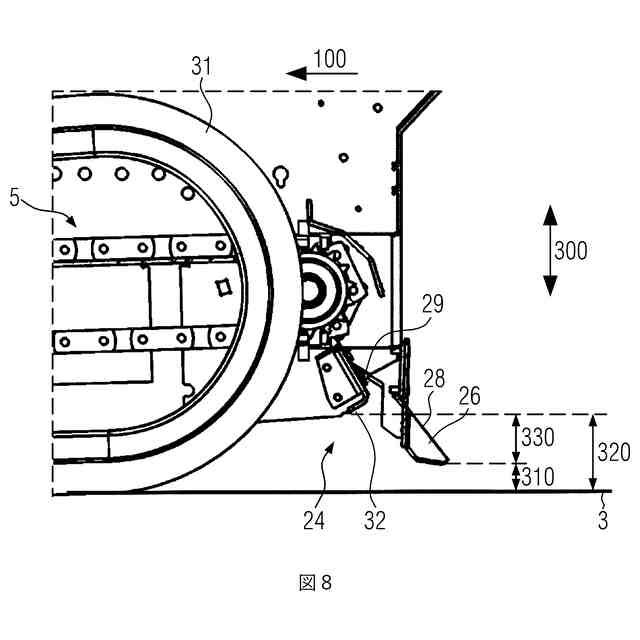 通常、固定式デフレクタプレートが縦方向搬送装置の後端の下方に配置されている。舗装の最中、縦方向搬送装置から交差方向分配機構に材料が運ばれると、この材料が道路舗装機の走行方向に集積してしまう場合がある。これらの材料は交差方向分配機構の前方に集積して、舗装材料の分離や駆動ギアの汚染を引き起こしてしまう場合がある。これは、従来技術で公知である固定式デフレクタプレートでは限定的な範囲でしか防止されない可能性がある。デフレクタプレートの下における十分な地上高又は輸送トラックに乗り込むための十分に大きな乗り入れ角度が必要であるため、デフレクタプレートは要求されるほど低い位置に垂直に配置することはできない。デフレクタプレートが十分高くに配置されていないと、輸送トラックへの乗り込みの邪魔となり得、又は、輸送トラックの積込みランプへの乗り込みの際にデフレクタプレートが損傷を受けてしまう場合がある。