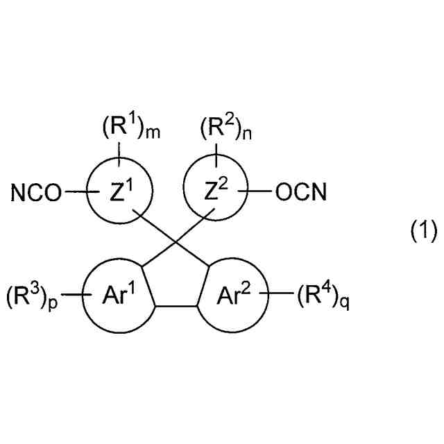 として、フルオレン-9,9-ジイル基が例示されている。この文献の実施例には、ジベンゾキサンテンジシアナート、ビス(4,4’-ジシアナトビフェニル-3-イル)ビフェニルメタンなどが使用されている。