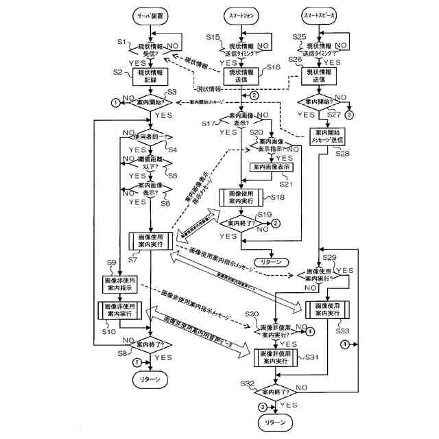 上記の課題を解決するために、請求項7に記載の発明は、取得手段と、判定手段と、送信手段と、を備えるサーバ装置において実行される情報処理方法であって、画像を表示する表示装置の現状を示す表示装置現状情報と、音声を出力する出力装置の現状を示す出力装置現状情報と、を前記取得手段によりそれぞれ取得する取得工程と、各前記取得された表示装置現状情報及び出力装置現状情報に基づいて、前記表示装置及び前記出力装置が予め設定された範囲内にあるか否かを前記判定手段により判定する判定工程と、前記表示装置及び前記出力装置が前記範囲内にあると判定された場合、(i)案内のための前記画像である案内画像と、当該案内画像を表示させる指示と、を前記表示装置に対して前記送信手段により送信し、(ii)前記案内画像を使用する案内のための案内音声である画像使用案内音声と、当該画像使用案内音声を出力させる指示と、を前記出力装置に対して前記送信手段により送信し、前記表示装置及び前記出力装置が前記範囲内にないと判定された場合、(iii)前記音声のみを使用する案内のための当該音声である画像非使用案内音声であって出力内容が前記画像使用案内音声と異なる画像非使用案内音声と、当該画像非使用案内音声を出力させる指示と、を前記出力装置に対して前記送信手段により送信する送信工程と、を含む。