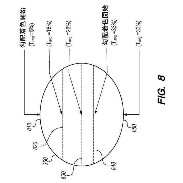 1つ以上の実施形態では、勾配着色は、レンズの世界側上部部分から開始してレンズの世界側底部部分へとより多くの実世界光を徐々に透過させる。レンズの上部縁における第1の透過度平均(T
