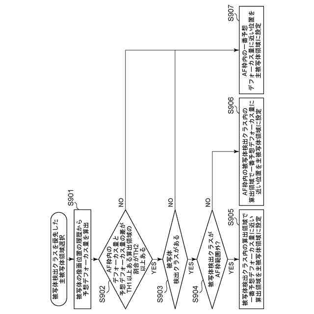 また、特許文献2では、被写体認識機能を備え、被写体認識領域から得たデフォーカス量が所定以下だった場合、そのデフォーカス量を用いてフォーカスレンズを制御して被写体に合焦させ、被写体認識領域から得たデフォーカス量が所定以上だった場合、AF枠といった被写体認識領域以外の領域から得られるデフォーカス量を用いてフォーカスレンズ制御を行う。撮影画面の表示に関するものとして、特許文献3では、特許文献2と同様に被写体認識領域から得たデフォーカス量が所定以下だった場合、AF枠を非表示にして被写体認識領域を示す枠を表示させ、被写体認識領域から得たデフォーカス量が所定以上だった場合、AF枠を表示させて被写体認識領域を示す枠を非表示にする。
