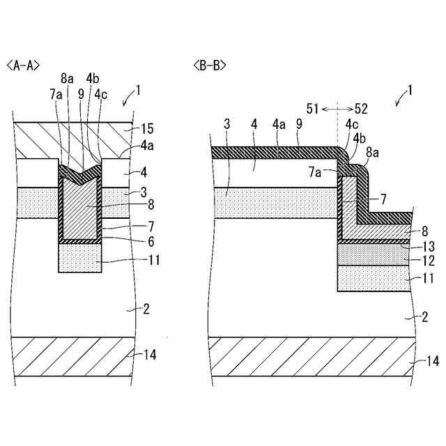 断面視において、前記ゲートトレンチの側面と前記不純物領域の前記上面との間に凹部が設けられ、
