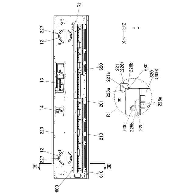 本発明の実施形態に係る鍵盤楽器の組立方法の説明図であって、図11の状態から鍵盤部を前進させた状態を示す、図10のXI-XI断面に相当する断面図である。なお、複数の鍵は断面とせず、基板やスイッチ等、一部の部材は省略されている。