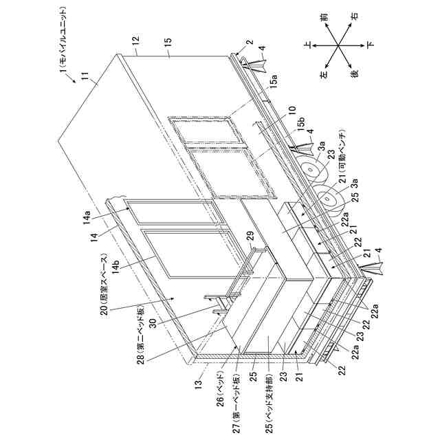 ところで、モバイルユニットを居住や宿泊の目的で利用する場合はベッドの設置が想定されるが、ベッドは場所を取るため、その分、生活空間が狭くなってしまうという問題がある。また、このような問題は、モバイルユニットだけでなく、空間の広さに制限のある部屋でも共通して生じ得る。