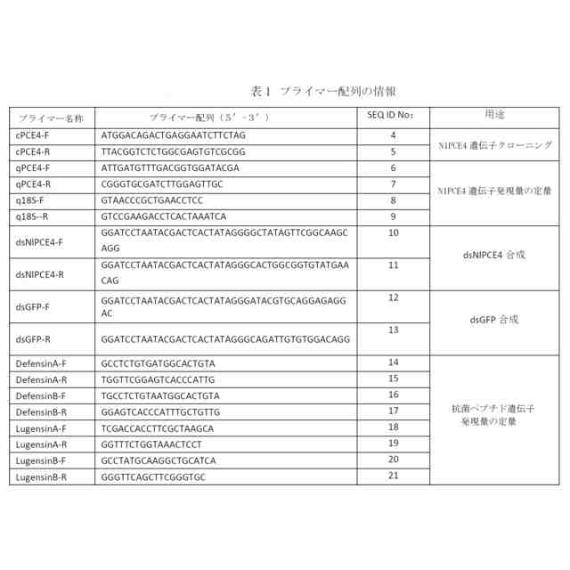 上記のトビイロウンカの抗菌ペプチドの発現を阻害する阻害剤は、遺伝子クローニングによりトビイロウンカのNlPCE4遺伝子のcDNA配列を取得し、NlPCE4遺伝子をクローニングするためのプライマーはcPCE4-F SEQ No ID:4及びcPCE4-R SEQ No ID:5である。