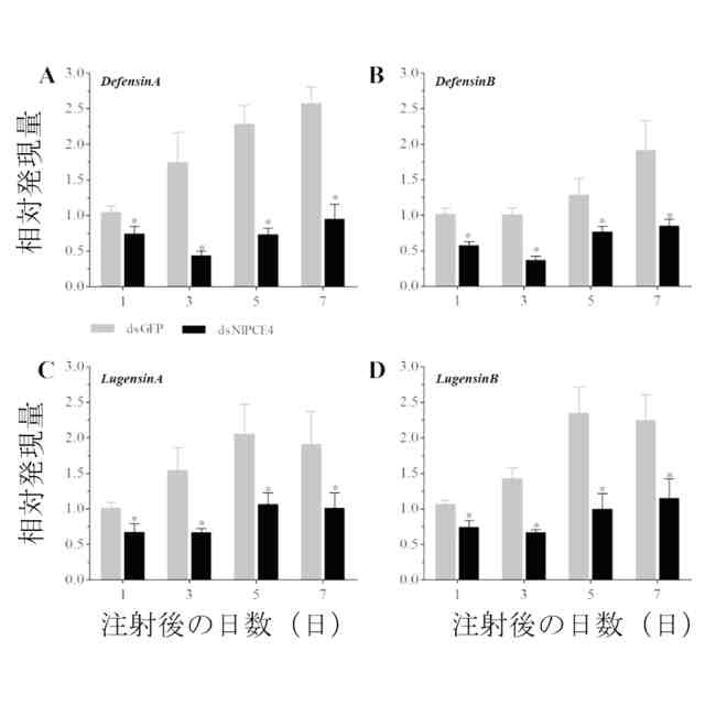 上記のトビイロウンカの抗菌ペプチドの発現を阻害する阻害剤は、dsNlPCE4であり、トビイロウンカの4つの抗菌ペプチドをコードする遺伝子、DefensinA、DefensinB、LugensinA、およびLugensinBの発現量を大幅に低下させることができる。