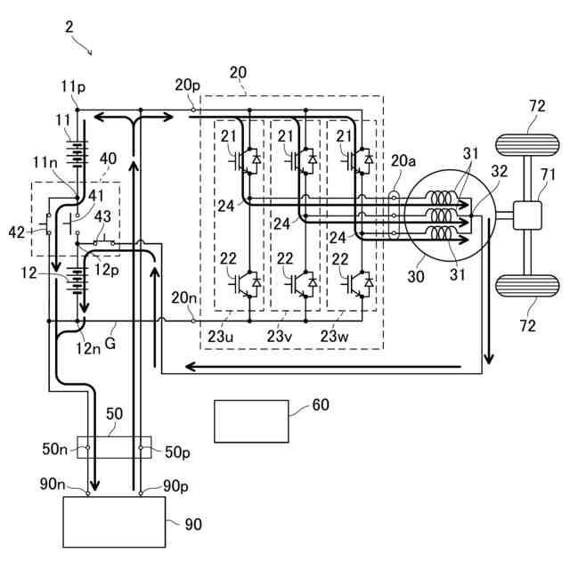 コントローラは、第1バッテリと第2バッテリでモータを駆動する場合は直列状態となるように回路セレクタを制御する。このとき、第1バッテリと第2バッテリはインバータの直流正極端と直流負極端の間に直列に接続される。