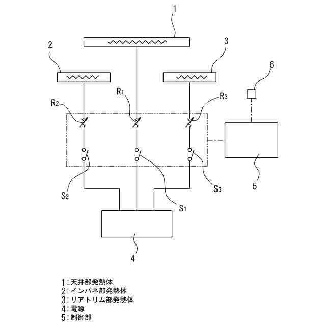 このように構成することにより、車室上部投影面積に近い面積の主発熱体で、比較的低温の発熱を行うことで、循環を抑制した車室内のCO2の温室効果により車室内の空気を温めることができる。また、車室空間面積に対し、主発熱体の面積が十分でない場合は、前部補助発熱体と後部補助発熱体を選択して発熱することで、循環を抑制した車室内のCO2の温室効果により車室内の空気を温めることができる。