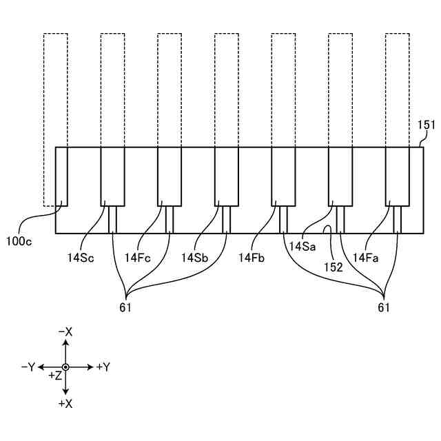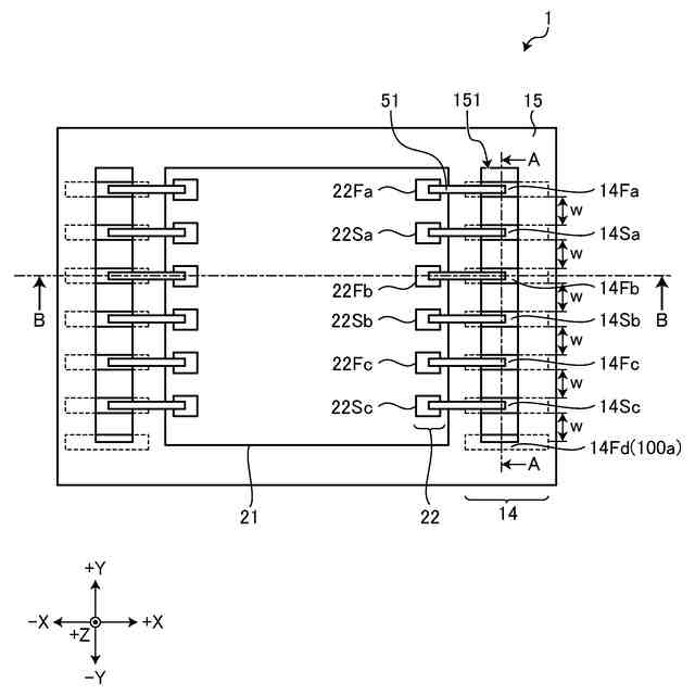 前記第2のボンドフィンガの両側に配置される2つの前記第1のボンドフィンガは、前記第1方向と交差しかつ前記第1面に沿う第2方向の両端部において接している、