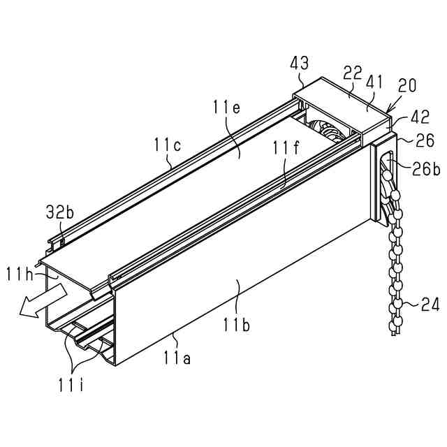 【解決手段】ヘッドボックス11の端部に配置される操作側キャップ21と、プーリ25が配置される支持部材26と、キャップ23とヘッド端部との間に配置されるカバー22と、を備える。キャップ23は、端部開口11gを塞ぐように配置される主面部31からヘッド側壁11b,11cの内面に沿って延びる第1弾性片32を備え、第1弾性片32は、ヘッド側壁11b、11cが備える第1連結孔32bと係合する第1係合部32aを備える。カバー22は、第1弾性片32における第1係合部32aが第1連結孔32bから外れる方向の弾性変位を規制する規制部45と、ヘッド側壁11b,11cを外側から覆い、ヘッド側壁が互いに離間する方向に変位することを規制する一対のカバー側壁42,43と、を備える。