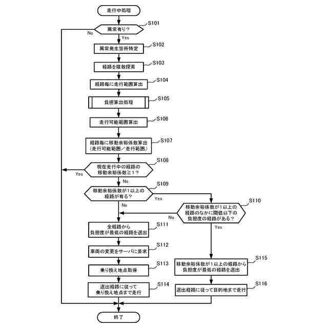 【解決手段】異常検出部1501が車両の状態を示す車両情報に基づいて、目的地に向けて走行している車両の異常を検出し、異常発生箇所特定部1502が検出された異常の異常発生箇所を特定し、走行可能範囲算出部1505が異常の内容に基づいて、車両が走行に支障をきたすまでの走行可能範囲を算出し、経路探索部1503が車両の現在位置から目的地までの複数の経路を探索し、各経路の目的地までの走行範囲を算出し、各経路について、経路を走行した場合の異常発生箇所に対する負担度を算出する。経路選出部1506は、走行範囲に対する前記走行可能範囲の比率である走行余裕係数が所定値以上である経路のなかから、負担度が低い経路を、車両の走行経路として優先的に選出する。