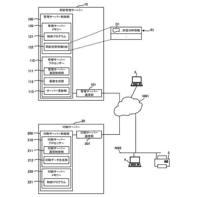 問診管理サーバー、及び印刷サーバーの構成を示す図。