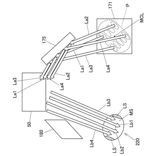 本発明の実施形態に係る光出射装置からの光がマイクロレンズアレイ及び表示素子を介して投影光学系に入射する様子を示す模式図であって、光出射装置からの光がマイクロレンズアレイに対して偏らせて照射した場合を示す。本図では、マイクロレンズアレイには、紙面の裏側から光が入射するように表されている。