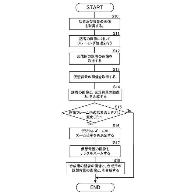 遠隔会議等では、カメラで撮影した話者の画像と仮想背景の画像とを合成した合成画像を用いる場合がある。従来、話者をカメラで追尾するフレーミング処理を行ったときに話者の画像が変化しても仮想背景は変化しなかったため、合成画像を見るユーザは、違和感を覚えることがあった。