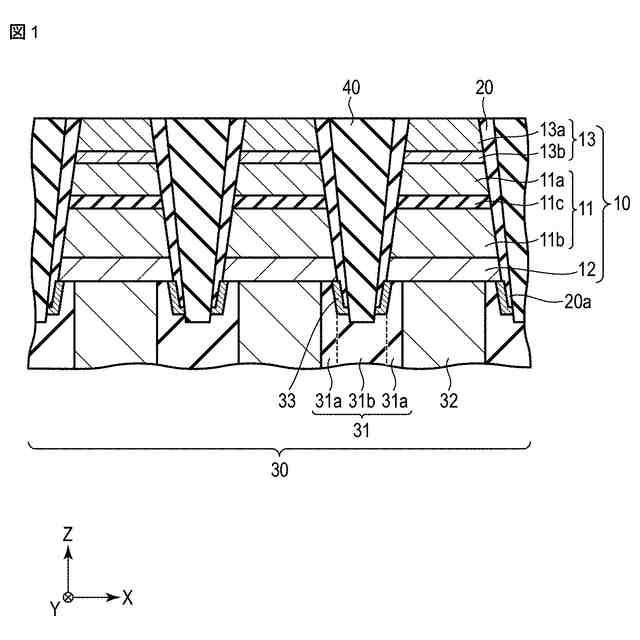 複数の積層構造10は、下部構造30上に設けられており、X方向及びY方向にアレイ状に配置されている。各積層構造10は、複数の層がZ方向に積層された構造を有している。なお、X方向、Y方向及びZ方向は、互いに交差する方向である。具体的には、X方向、Y方向及びZ方向は、互いに直交している。