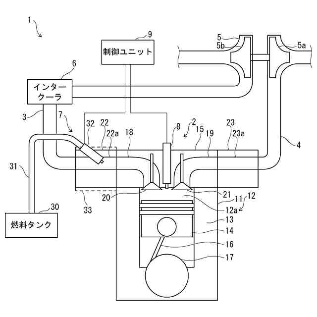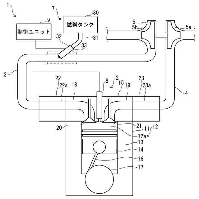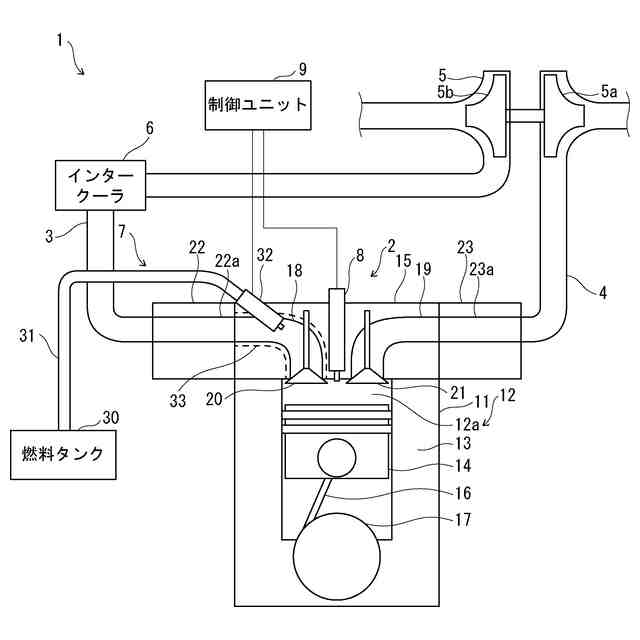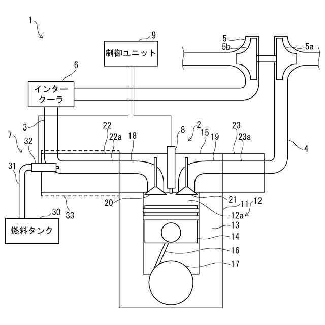 従来、エンジン装置には、アンモニアやメタノール等の温室効果ガス排出量の少ない低GHG燃料をエンジンに供給して駆動するものがある。エンジン装置は、液体状態の低GHG燃料を貯蔵していて、エンジンに通じる吸気経路やエンジンの燃焼室に対して低GHG燃料を噴射することで、燃焼室に低GHG燃料を供給する。