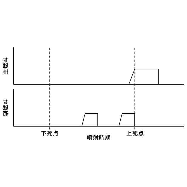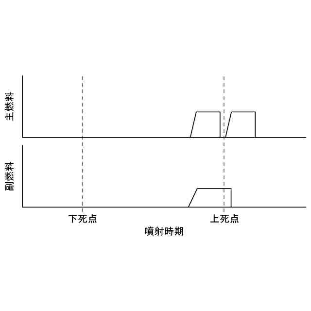 本発明の実施形態に係るエンジン装置における主燃料及び副燃料の噴射時期の例を示すグラフである。
