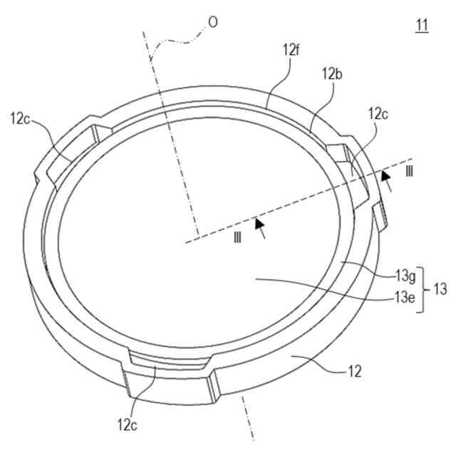 以下、本発明の実施例について、図面を参照しながら詳細に説明する。図1(A)は本発明の実施例1に係るPMOレンズ13(プラスチックモールドレンズ、光学素子)の斜視図である。図1(B)は、図1(A)の断面線IB-IBにおけるPMOレンズ13の部分断面図である。図2は、実施例1のレンズホルダ組立体11を表す斜視図であり、接着剤14は不図示である。図3(A)は、図2の断面線III-IIIにおける部分断面図であり、レンズホルダ組立体11を、光軸Oを含む平面でカットし矢印方向に見た部分断面図である。図3(B)は、接着剤14を滴下した状態の部分断面図である。