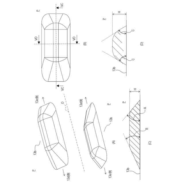 (A)微細突起Pの拡大斜視図である。(B)微細突起Pの平面図である。(C)図5(B)の断面線VC-VCにおける微細突起Pの断面図である。(D)図5(B)の断面線VD-VDにおける微細突起Pの断面図である。