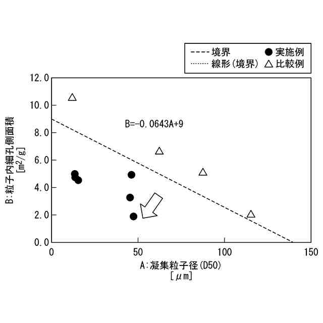 【解決手段】凝集粒子径(D50)[μm]をA、粒子内細孔側面積[m
