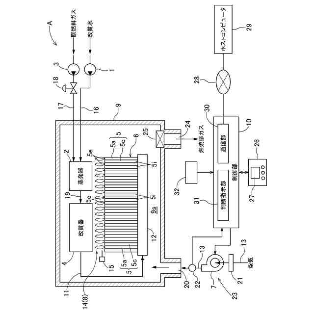 改質器で生成された水素含有ガスは、水素含有ガス路を通してマニホールドに供給され、そのマニホールドからセルスタックの複数のセルの燃料極に分配供給される。一方、空気は、空気ブロアにより空気供給路を通して収納容器の内部空間に供給され、収納容器の内部空間に供給された空気は、セルスタックの複数のセルそれぞれの空気導入部を介して、各セルの酸素極に供給される。燃料電池システムは制御部を有しており、制御部により燃料電池システムの運転が制御される。
