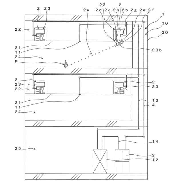 ところで、スプリンクラー設備においては、設置工事の際に、ヘッドに水を供給するための配管を建物等の躯体部分に沿って敷設する必要がある(前記非特許文献1参照)。特に、ヘッドが設置される天井面等の設置面の裏側には、多数の配管を敷設しなければならない。そのため、スプリンクラー設備には、配管工事が容易ではなく、設置工事が容易ではないという問題がある。