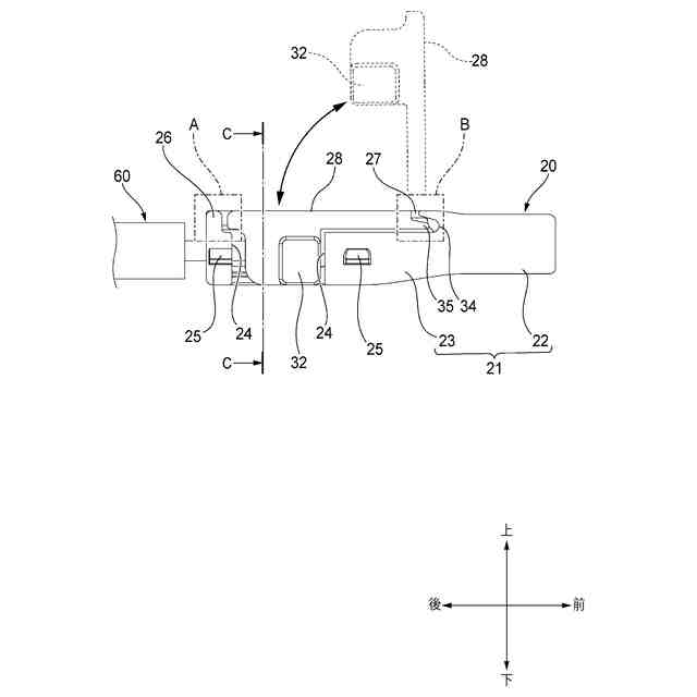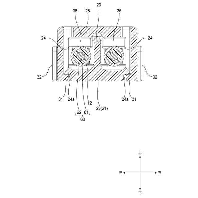 前記第2係合部に係合して前記収容方向において当該蓋部に対して前記アウタ端子が変位しないように前記アウタ端子を保持する第2被係合部と、当該蓋部が閉じているときに前記収容室に収容されることになる別端子に係合して前記収容方向における当該蓋部と前記別端子との相対変位を規制することになる第2規制部と、を有し、