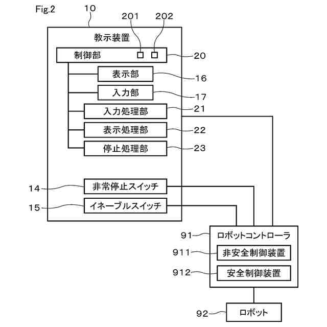 ロボットの教示等を行う操作装置には、作業者等の安全を確保するために、ロボットの非常停止を行う非常停止スイッチや、作業者が意図して操作している間にのみロボットの動作を許可するイネーブルスイッチが設けられている。
