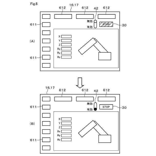 一実施形態によるロボットの操作装置の一例について、表示部に表示される画像の一例であって、(A)はイネーブルスイッチが握られておらず停止ボタンが無効になっている状態を示す図、(B)はイネーブルスイッチが握られて停止ボタンが有効になっている状態を示す図