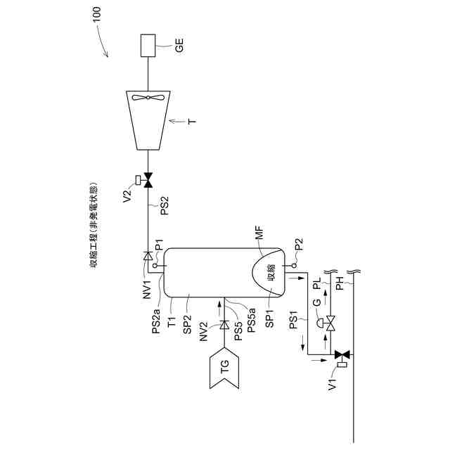 【解決手段】袋膜内部SP1を一時貯留槽T1へ受け入れられる対象ガスTGの圧力以上の高圧力の流体が通流する高圧導管PHに連通接続可能に構成し、タービンTの回転動力により発電可能な発電機GEを備え、貯留空間SP2に対象ガスTGが存在する状態で、袋膜内部SP1と高圧導管PHとを連通させる膨張工程を実行すると共に、膨張工程にて昇圧された貯留空間SP1の対象ガスTGを、一時貯留槽T1の吹出部PS2aから吹出してタービンTを回動させる形態で発電機GEにて発電する制御装置を備える。