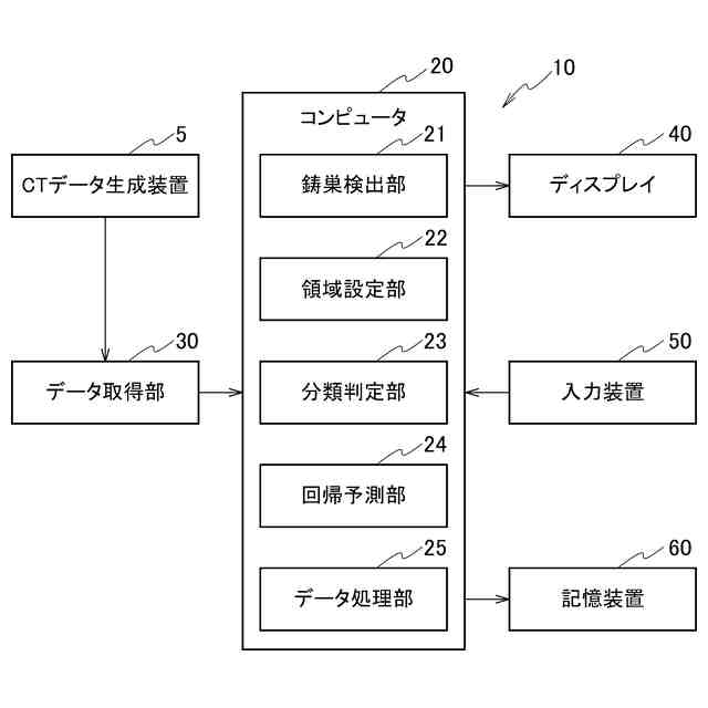 図1を参照し、本実施形態に係る製品検査装置10を説明する。製品検査装置10は、鋳造製品の欠陥を検査する装置である。例えば、鋳造製品は、車両に搭載されるエンジンのシリンダブロックであり、金型内に材料(例えばアルミニウム合金)の溶湯を流し込んで成型されている。鋳造製品の内部領域には、空隙である鋳巣が発生している。製品検査装置10は、鋳造製品の内部領域にある鋳巣を検出し、検出した鋳巣に基づいて鋳造製品の欠陥を検査する。ここで、鋳造製品の内部領域とは、設計上材料が満たされている領域であり、鋳造製品の内部形状として造形される空間を含まない意味である。